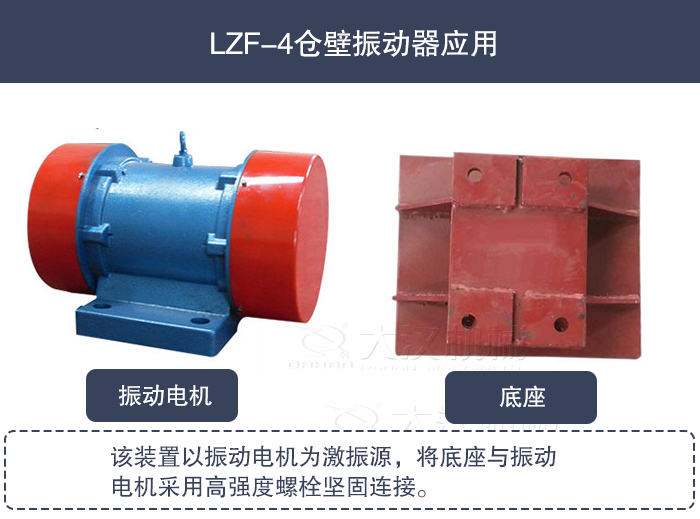 LZF-4倉壁振動(dòng)器是應(yīng)用振動(dòng)電機(jī)的一個(gè)典型實(shí)例。該裝置以振動(dòng)電機(jī)為激振源,將底座與振動(dòng)電機(jī)采用高強(qiáng)度螺栓堅(jiān)固連接。